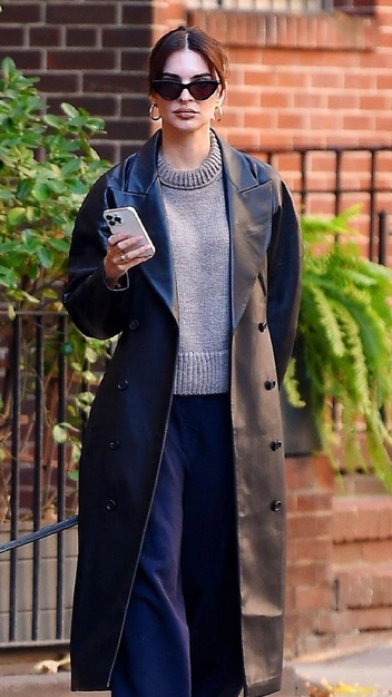 Если вам кажется, что в верхнюю одежду не стоит вкладываться, то Эмили Ратаковски убеждает нас в обратном. Знаменитость появилась в лаконичном образе и показала, как модный кожаный плащ способен преобразить весь внешний вид. Она отдала предпочтение длинному изделию в длине миди из плотного материала. Чтобы кожаные вещи не выглядели дешево, стоит также обращать внимание и на состав: например, блестящие куртки и плащи могут выглядеть не так эффектно, как матовые.