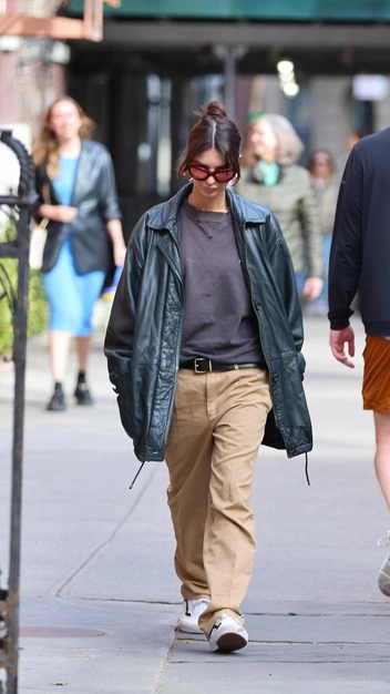 Эмили Ратаковски для весенней прогулки выбрала мужской образ, что мы даже призадумались, у какого парня она одолжила утром эти стильные вещи? Модель надела свободный лонгслив с необработанным вырезом на горле и бежевые штаны, которые она подчеркнула кожаным ремнем. Дополнила селебрити аутфит объемной курткой, белыми кроссовками и стильными очками с цветными стеклами.