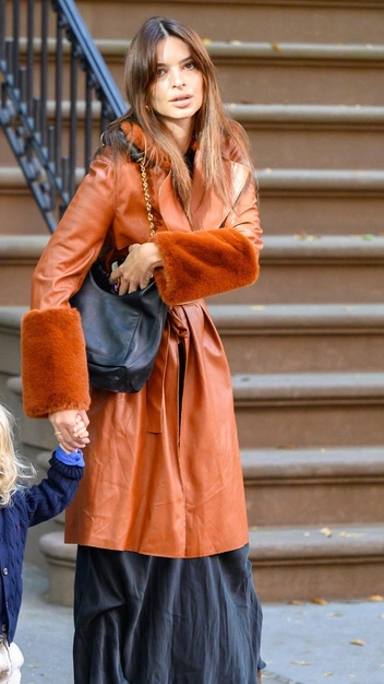 Если вам казалось, что Эмили Ратаковски позабыла о своей тяге к винтажу, то ее новый выход говорит об обратном. Модель тоже утеплилась и сделала это эффектно и со вкусом. Она надела базовый лонгслив и подобрала к нему юбку макси с мятым эффектом, которая смотрится небрежно, но при этом стильно. В качестве верха знаменитость выбрала кожаный плащ с меховыми манжетами и воротом, и завершила она выход замшевыми сапогами и объемной сумкой на цепи.