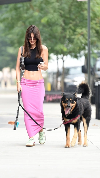 Юбка макси на низкой посадке — самая модная вещь в женском гардеробе прямо сейчас. Эмили Ратаковски выбрала для себе ее в розовом цвете из трикотажа, однако вы можете присмотреться и к другим фасонам. Так, популярными являются также длинные джинсовые юбки с накладными карманами, необработанным подолом, потертостями и разрезами. Дополнила селебрити трендовый предмет одежды укороченным топом, подчеркнув талию, а также кроссовками и сумкой.
