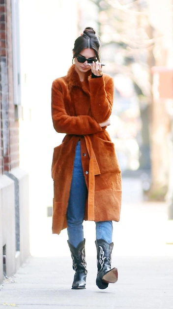 Эмили Ратаковски точно знает лучшие винтажные магазины Нью-Йорка, потому что найти стильные ковбойские сапоги в обычной жизни нелегко. К ним звезда подобрала узкие голубые джинсы и завершила выход свободной меховой шубой с накладными карманами в насыщенном оранжевой цвете. Обратите внимание и на аксессуары: солнцезащитные очки и лаконичные серьги-кольца — ничего лишнего.