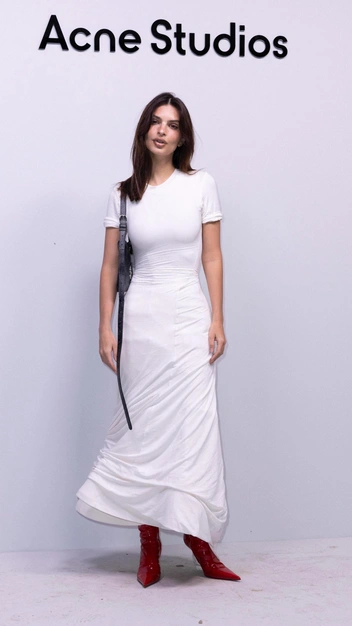 Если вы хотите знать самые актуальные тенденции сезона, тогда следите за выходами Эмили Ратаковски — она разбирается в главных трендах. Например, на модный показ бренда Acne Studios звезда надела белоснежный наряд: облегающий топ с короткими рукавами и юбку макси на высокой посадке. Акцент был сделан на аксессуарах: безупречных лакированных сапогах с острым мысом и тонким каблуком и сумкой с эффектом потертостей.