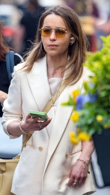 Один из главных айтемов стиля аристократов — длинное платье в молочном оттенке с разрезом, как у Эмилии Кларк. Голливудская звезда дополнила дорогой наряд жакетом, у которого небрежено закатала рукава. К выходу она подобрала аксессуары: бежевые замшевые мюли с острым мысом, объемную кожаную сумку на длинном ремешке и солнцезащитные очки с цветными стеклами. Нравится нам и ее выбор украшений: браслет из ракушек и золотая цепь на запястье с подвесками.