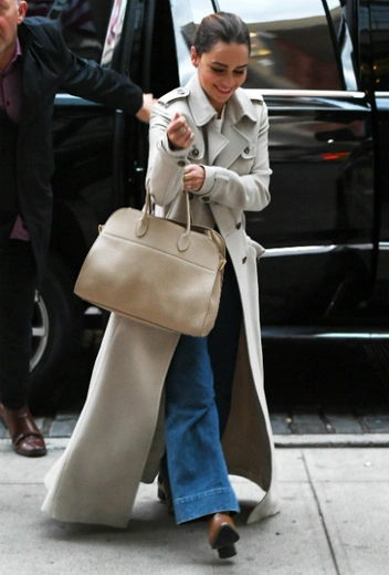 В наших широтах тренчи и легкие полусапожки уже носить не по погоде: в ход начинает идти тяжелая артиллерия в виде дутых курток и утепленных вариантов пальто. А вот в Нью-Йорке знаменитости еще вовсю выгуливают аутфиты в непринужденном стиле city chick. Эмилия Кларк в очередной раз доказывает, что она любит и умеет носить их получше супермоделей: тренч в светлом оттенке идеально дополнил комбинацию из белой кофты, джинсов с широкими штанинами и коричневых ботинок. Образ актрисы выгодно дополнила широкая сумка в тон тренча и минималистичные украшения.
