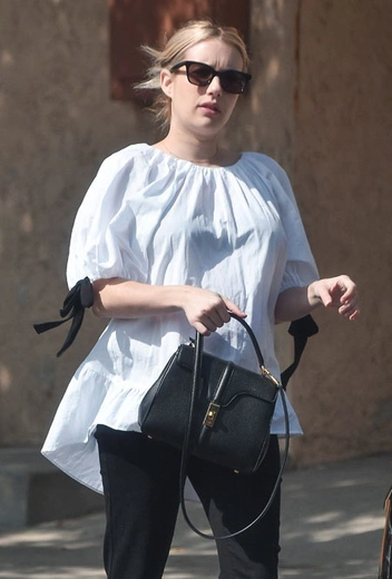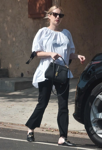 Эмма Робертс всегда с интересом примеряла новые тенденции и показывала нам стильные образы на каждый день. Правда, и находясь в положении она совсем не ослабила хватку и все также раз за разом появляется в стильных аутфитах, которые могут стать вдохновением для всех. Накануне актриса вместе со своим возлюбленным Гарретом Хедлундом отправилась в гости к друзьям. Девушка примерила объемную хлопковую блузу с бантами, черные джинсы bootcut, мюли с декором и миниатюрную сумочку жесткой формы.