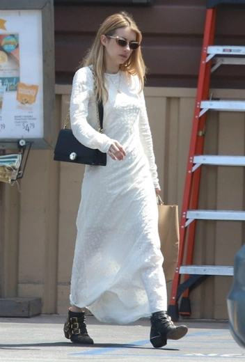 Вопреки стереотипам, классические белые наряды – уже давно далеко не только для свадеб. В очередной раз это доказала Эмма Робертс: папарацци засняли девушку в длинном белом платье, которое она сочетает с черной минималистичной сумкой, брутальными кожаными ботильонами с заклепками в ковбойском стиле от бренда Chloé и очками Oliver Peoples.