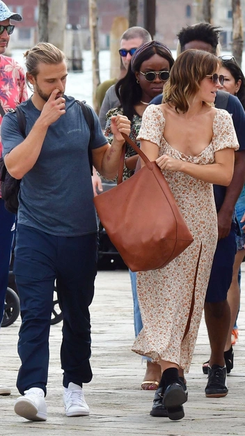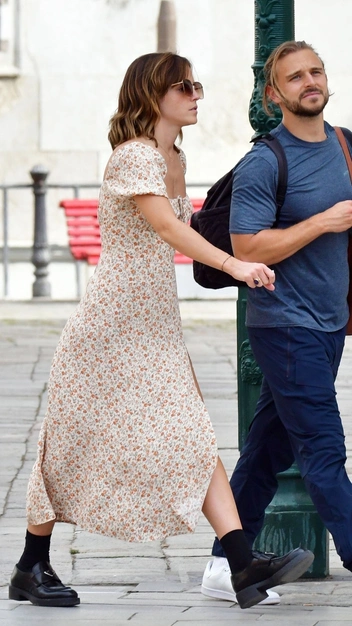 Эмма Уотсон уверена, что летние платья актуальны и осенью. Так, звезда носит модель длины миди с коротким рукавом и цветочным принтом в сочетании с черными кожаными лоферами и короткими носками. Для более прохладной погоды к такому луку можно добавить кашемировый джемпер или кардиган. Эмма дополнила лук вместительной кожаной сумкой.