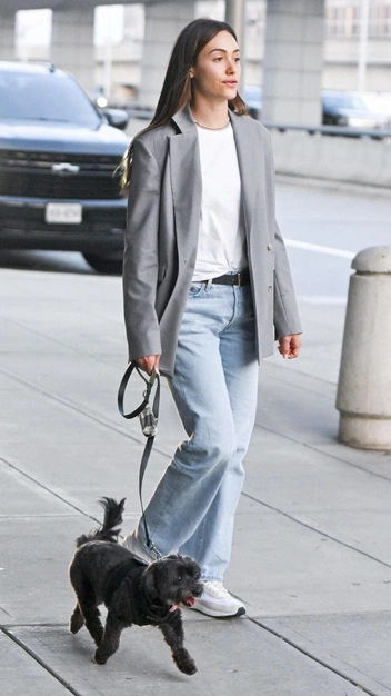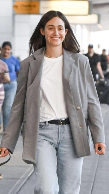 Многие девушки давно присматриваются к базовым вещам в гардеробе: их легко стилизовать между собой, а образы всегда получаются актуальными и модными. Эмми Россум доказала, что капсула — рабочий прием, и появилась в эффектном аутфите, который вы легко сможете повторить. Вам понадобятся: лаконичная футболка свободного кроя, которую можно небрежно заправить в широкие джинсы. Дополните выход пиджаком прямого кроя и добавьте аксессуаров и украшений.