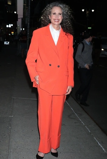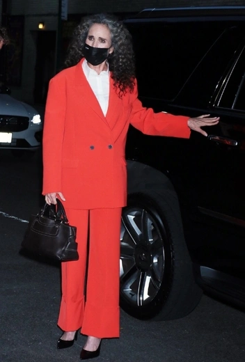 Энди Макдауэлл взрывает звездную стритстайл-хронику оригинальным луком в деловом стиле, разбивая все стереотипы об официальном гардеробе. В центре внимания звезды — оверсайз и насыщенный морковный оттенок, которые в сочетании друг с другом дают эффект разорвавшейся бомбы. Для «Позднего шоу со Стивеном Кольбером» Энди примерила расслабленный брючный костюм в самом колоритном оттенке красной палитры и удачно дополнила аутфит классической черной сумкой и туфлями-лодочками в тон на небольшом каблуке.