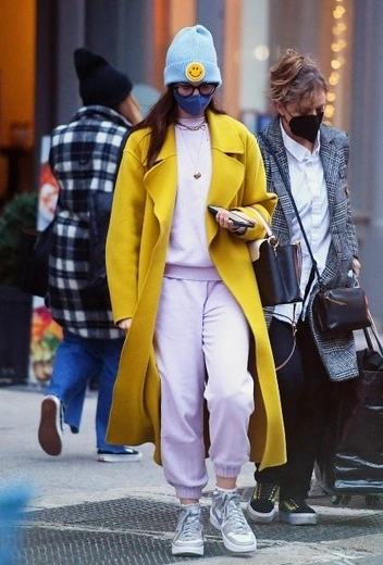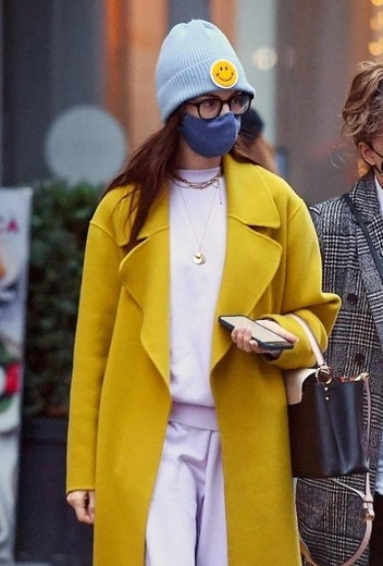 Энн Хэтэуэй врывается в стритстайл Нью-Йорка в фэшн-луке, который настраивает на позитивный вайб несмотря на непогоду за окном. Этой осенью актриса делает ставку на полуспортивный стиль и вносит в повседневный выход больше красок: Хэтэуэй дополняет обычный casual-лук яркими аксессуарами и верхней одеждой в одном из самых осенних оттенков. Знаменитость выгуливает полуспортивный костюм в пыльно-розовом цвете в миксе с горчичным пальто, сникерсами и голубой шапкой со смайликом. Энн дополняет лук очками, драгоценными украшениями и синей защитной маской.