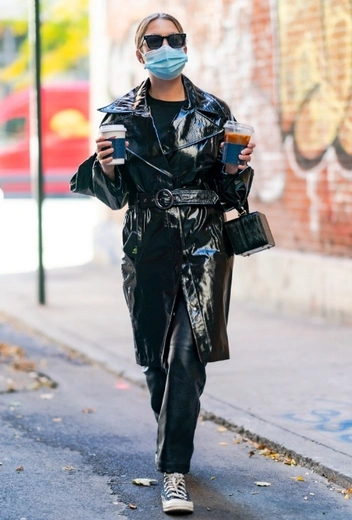 После разрыва с британской супермоделью Эшли не перестала быть объектом пристального внимания со стороны общественности и, по замечаниям модных критиков, провела значительный апгрейд своего вкуса и стиля. Этой осенью красотка предпочитает выгуливать различные вариации образов в total-black. Одна из последних стала нашей любимой. Бенсон продемонстрировала сочетание прямых кожаных брюк, лакированного тренча и черной трикотажной кофты. Аутфит завершили черные кеды Converse, мини-сумка кубической формы и солнцезащитные очки.