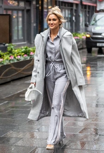 Достойная альтернатива тотальному черному и белому — серый монохром, который крайне богат на различные оттенки и идеален для колор-экспериментов. Отличный пример подает Эшли Робертс, которая выгуливает оригинальный casual-образ в серой цветовой палитре. Звезда примеряет расслабленный брючный образ в полуспортивном стиле со светло-серым пальто. Лук дополняют туфли-лодочки в светлом оттенке и белая мини-сумка.