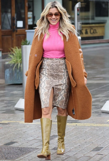 В вопросах выбора офисного наряда нам нередко стоит быть аккуратными – далеко не все цветовые сочетания могут быть уместны в рамках дресс-кода. Зато если ваш деловой регламент позволяет экспериментировать с оттенками, явно стоит взять на вооружение несколько приемов Эшли Робертс, которая обожает классический стиль, но при этом всегда ратует за необычные сочетания. На днях она решила взять за основу ярко-розовую водолазку и дополнить ее акцентной юбкой со змеиным принтом, высокими оливковыми сапогами и длинным карамельным пальто.