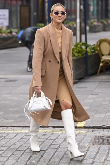 Эшли Робертс — один из главных мастеров по комбинации цветов. Звезда одинаково легко управляется как с яркой палитрой, так и с базовой и нейтральной. При этом все ее образы не выглядят чрезмерно броско или, наоборот, слишком скучно, поэтому у нее точно стоит взять несколько уроков по цветовым сочетаниям. В новом образе она показала, какой оттенок идеально сочетается с классическим бежевым — им стал, конечно, кипенно-белый цвет. Звезда выбрала пальто и трикотажное платье нюдовой палитры и дополнила образ светлыми сапогами, миниатюрной сумочкой в тон и очками в овальной оправе.