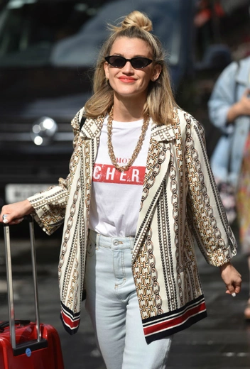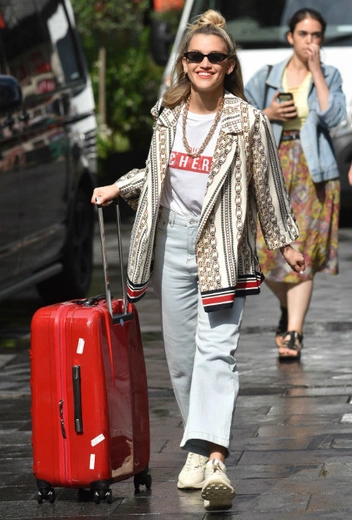Образ — вдохновение дня. Цветовая гамма этого аутфита ну очень близка к идеальной: светло-голубой, красный, золотой и кремовый дают вместе «вкусный» и сбалансированный лук. Эшли дополняет его массивной цепью, узкими черными очками и прической в стиле messy. Отправляясь в поездку, не забываем, что ваш багаж также может стать аксессуаром к выбранному аутфиту. Постарайтесь учесть это перед покупкой чемодана, чтобы в день отлета быть на пике стиля.
