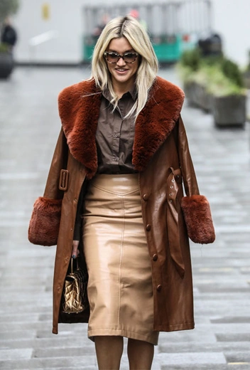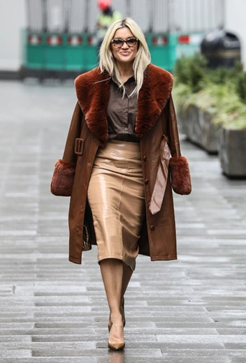 Лучше всего ведущей Эшли Робертс удается экспериментировать с цветами. Мы уже видели, как она мастерски обходится и с яркой неоновой палитрой, и красочными принтами, и с нежной пастельной гаммой, и с благородными насыщенными оттенками. У звезды точно стоит посмотреть несколько цветовых сочетаний, которые легко интегрировать и в собственный гардероб. Для визита на студию она решила примерить сдерзаннуд бежевую юбку-карадаш, рубашку цвета горького шоколада и лаковое пальто с меховой отделкой медного оттенка.