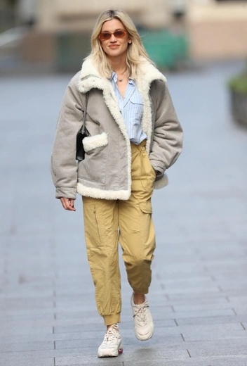 За последние полторы недели, несмотря на бушующую пандемию и режим самоизоляции, Эшли Робертс успела выгулять не одну пару стильных образов, которые ярко выделились среди модного однообразия звездной стритстайл-хроники. Для начала весны знаменитость выбирает утепленные фэшн-луки, которые отлично подходят для еще прохладных апрельских дней. Певица выгуливает вельветовую куртку с меховой подкладкой в приятном сером оттенке, зауженные брюки карго и голубую блузу в вертикальную полоску. Образ дополняют белые кроссовки, черная сумка-клатч и солнцезащитные очки.