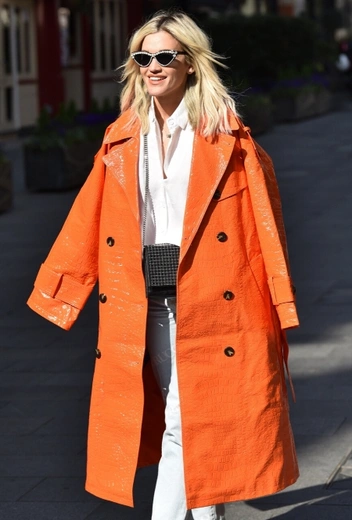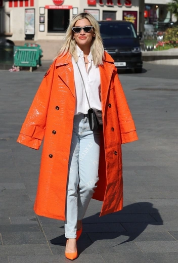 Пока что погода уверенно держится мартовских показателей, так что надеяться на скорое избавление от груза верхней одежды не приходится. Знаменитости подсказывают выход из ситуации: подбирайте пальто, тренчи и куртки в ярких оттенках, настраивая себя и окружающих на самую позитивную волну. Эшли Робертс выбирает кожаное пальто в насыщенном оранжевом оттенке и сочетает его со светлыми джинсами, белой блузой и лодочками в тон верха.