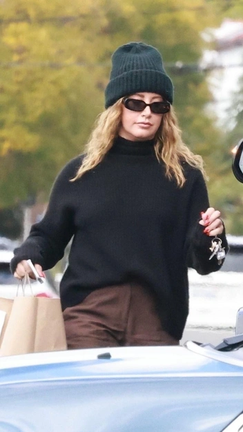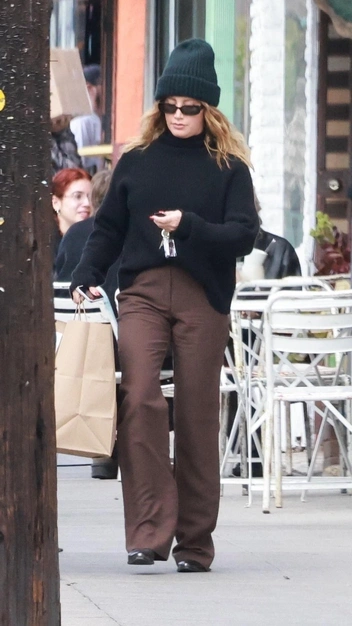 Эшли Тисдейл появилась в модном образе, который вам стоит повторить прохладной весной. Звезда надела лаконичный черный свитер объемного кроя и подобрала к нему широкие брюки в кофейной оттенке. Завершила она аутфит кожаными ботинками, стильной черной шапкой и солнцезащитными очками.