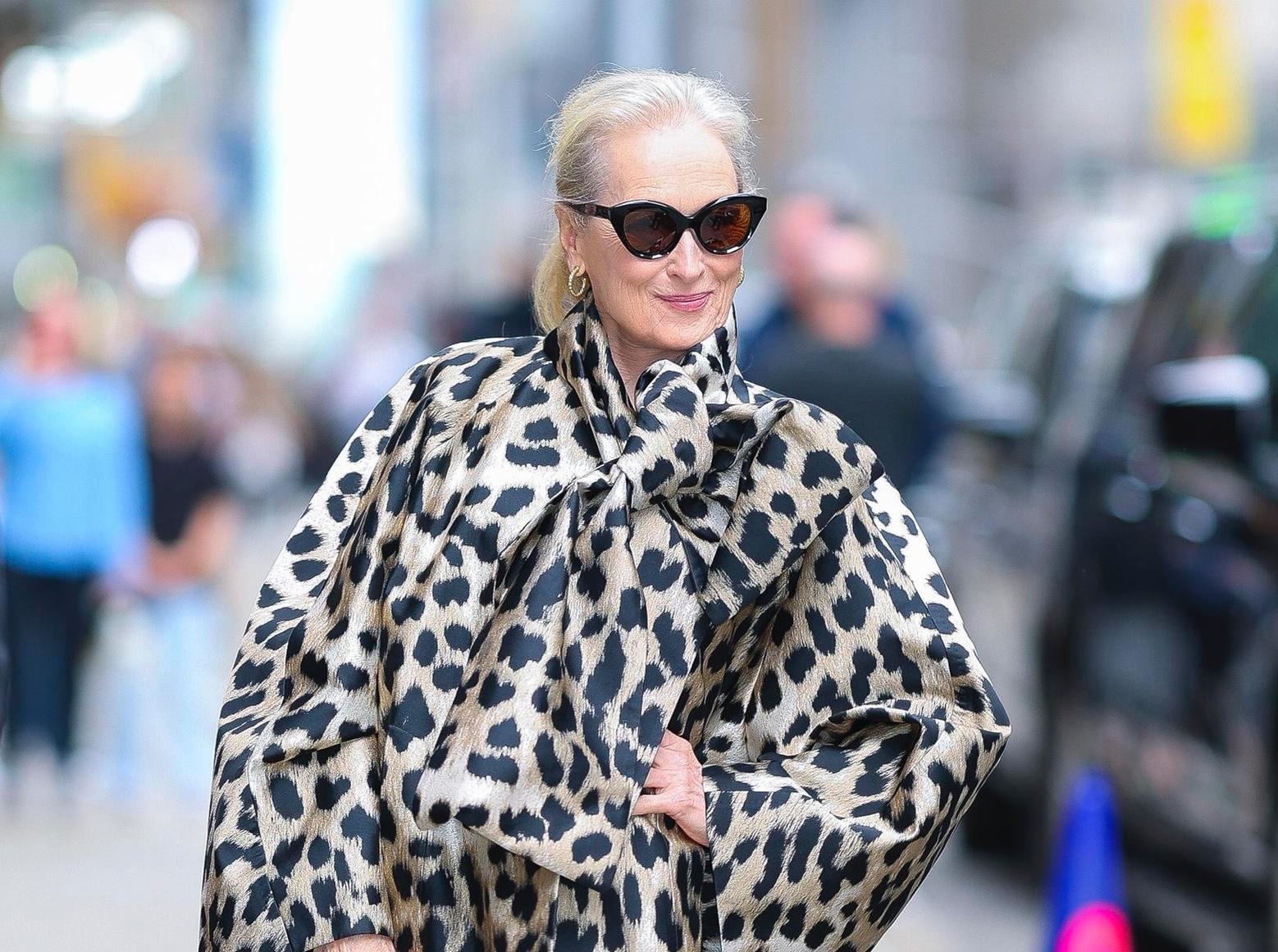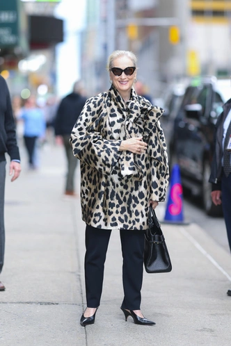 В этом выходе актриса почти полностью растворяется в своем альтер эго — Миранде Пристли: леопардовое пальто‑кокон с драматичным бантом у горла задает тон всему образу властной модной дивы, черные брюки и лаконичные лодочки выстраивают безупречную вертикаль, а крупная кожаная сумка и очки добавляют тот самый редакторский шик, благодаря которому кажется, что Мерил Стрип идет не по улицам Нью-Йорка, а по коридорам глянцевого журнала.