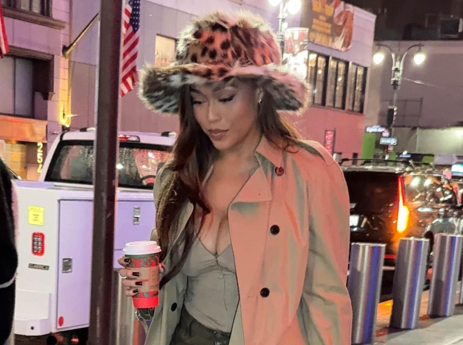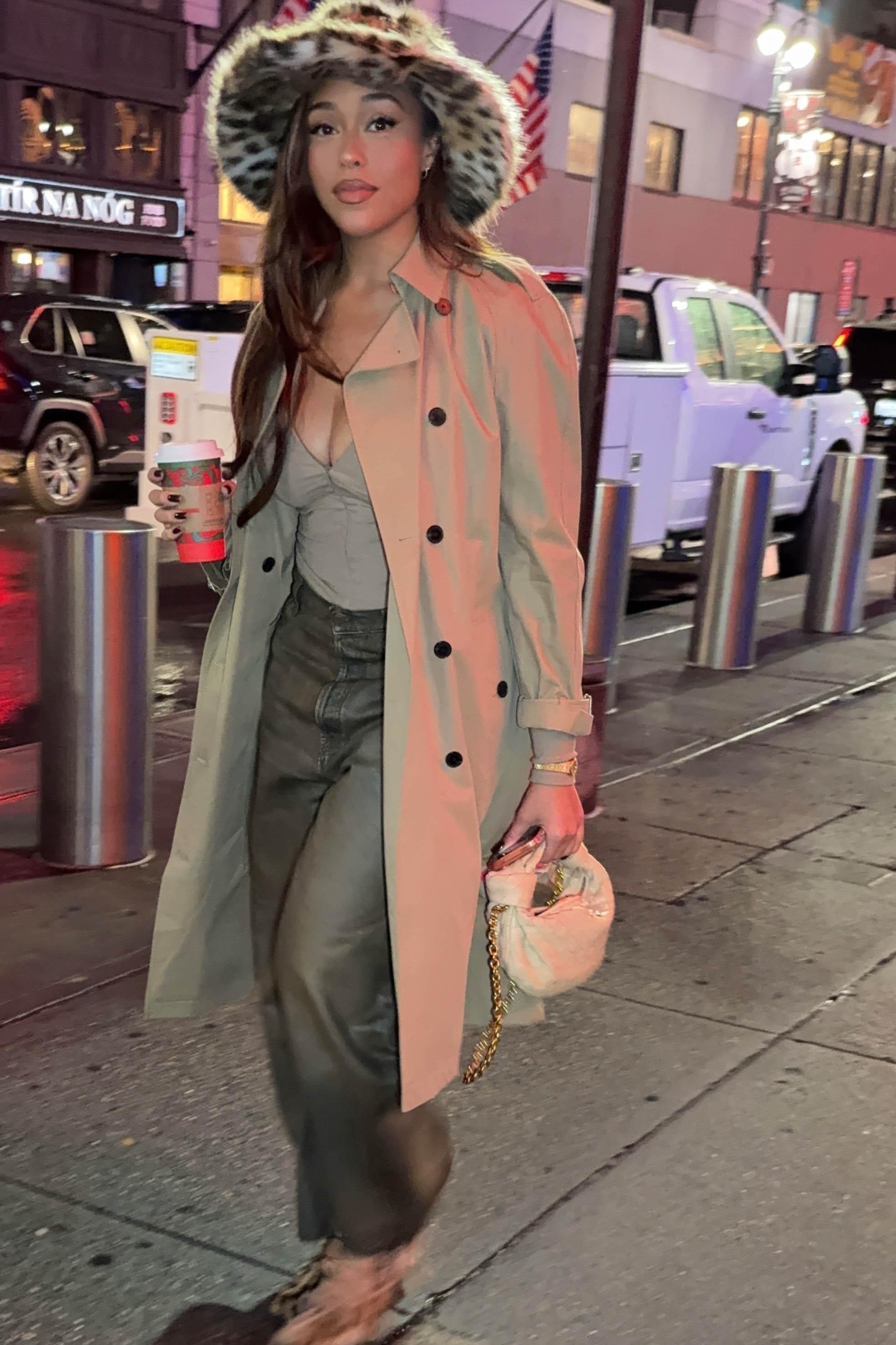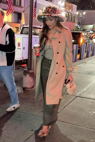 В этом сезоне Джордин Вудс делает ставку на меховые аксесссуары — как и многие западные селебрити и российские инфлюенсеры. Американская телезвезда сочетает любимую зимнюю панаму с базовым аутфитом: бежевым тренчем, свободными джинсами и мини-сумочкой от Bottega Veneta. Однако Джорджин решила пойти еще дальше и выбрала головной убор в самом модном принте сезона — леопарде, и попала сразу в два тренда: на анималистику и роскошный мех.