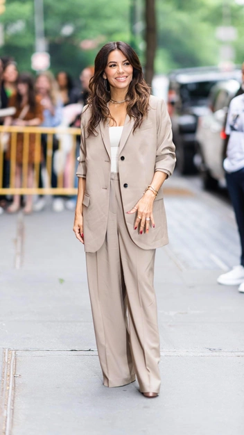 Последние выходы Евы Лонгории доказали, что ее коллекция костюмов внушительна, поэтому она, определенно, лучше других знает, как их носить. Например, на мероприятие актриса надела облегающий топ в молочном оттенке и дополнила его удлиненным пиджаком прямого кроя и брюками-палаццо в бежевом цвете. Чтобы образ получился более свободным и непринужденным, она закатала рукава и подобрала множество украшений: браслетов, колец и колье. В качестве обуви Ева Лонгория выбрала трендовые туфли на платформе — в стиле нулевых.