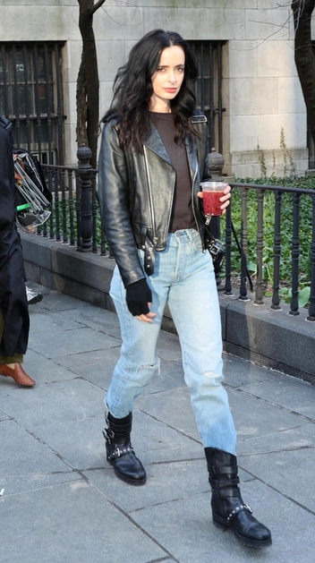 Аутфит Кристен будто собран по канонам идеальной гранж‑героини: короткая кожаная косуха, черный топ и вываренные прямые джинсы с легкими потертостями создают узнаваемый силуэт девушки из инди‑комикса, которая всегда выделяется из толпы. Брутальные байкерские ботинки с пряжками и перчатки без пальцев усиливают рок‑настроение, а свободные темные волосы добавляют к этому образу будничности — словно все это не продуманный стилистами лук, а естественное продолжение ее характера.