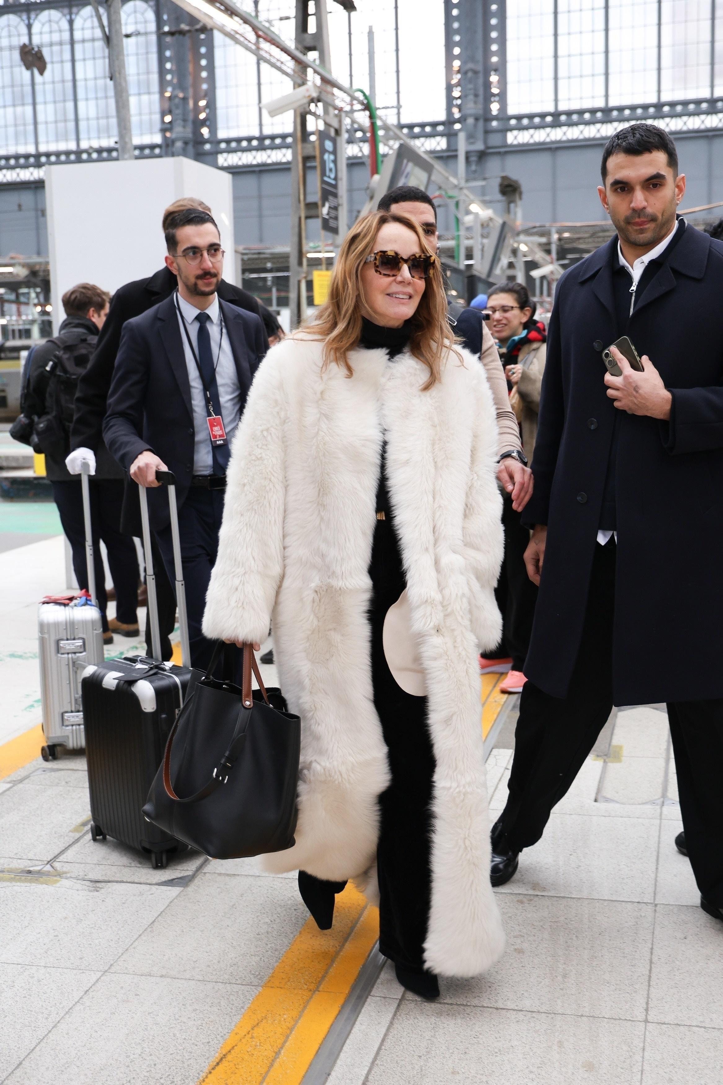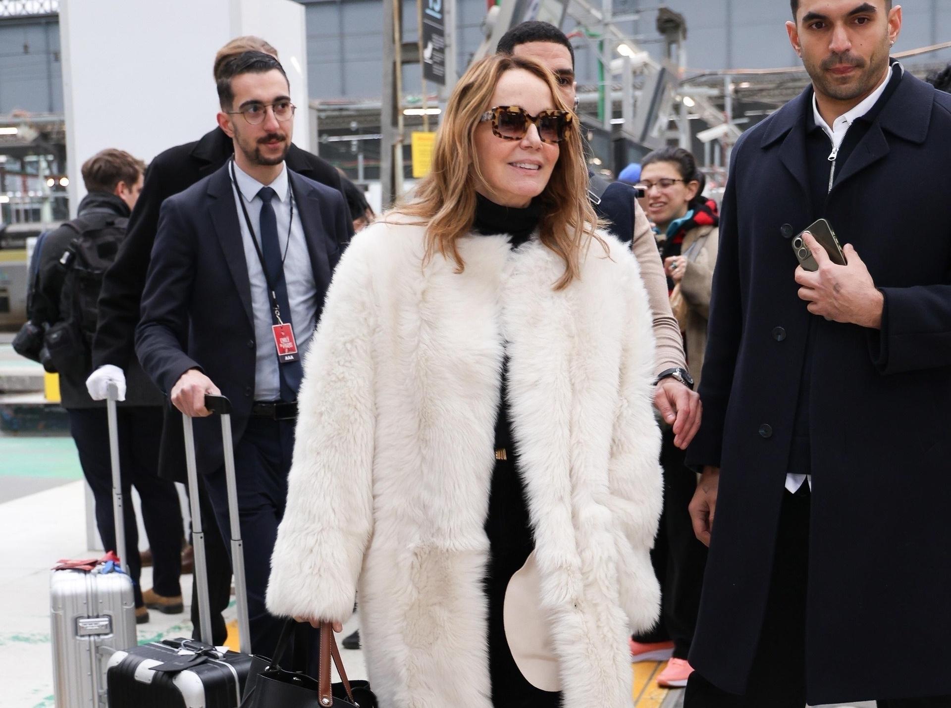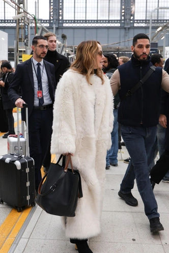 Актриса выходит на перрон так, будто это не вокзал, а модный подиум: длинная шуба из молочного меха почти стелется по плитке и мгновенно отменяет негласное тревел-правило — «в дорогу только худи и спортивные штаны». Строгое темное комбо под верхней одеждой делает контраст черного и белого очень эффектным — прием прямо в духе ее героини Сильви. Вместо маленькой «дорожной» сумочки — большой черный шоппер, с которым она одинаково уверенно смотрится и среди чемоданов, и в первом ряду фэшн-показа.