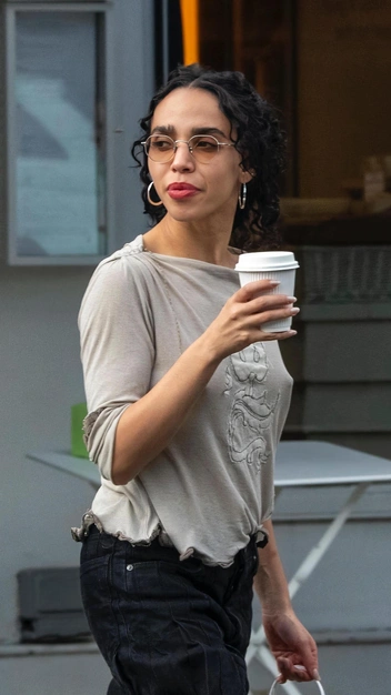 Талия Барнетт, известная как FKA twigs, обладает модным вкусом. Вот она пьет кофе в ультрамодной кофте, края которой словно обожжены, и стилизует ее с трендовыми черными карго на низкой посадке. Однако все наше внимание приковано к необычной массивной обуви на высокой тракторной подошве, что задает луку певицы еще большую аутентичность. Завершает она выход солнцезащитными очками с цветными стеклами и серьгами-кольцами.