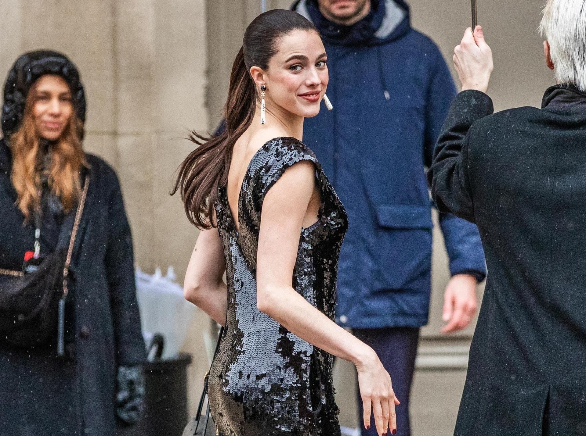 Маргарет приходит на дебютный кутюрный показ Матье Блази в самом лучшем платье дизайнера: лаконичное черное миди из пайеток повторяет силуэт классического платья‑футляра, но благодаря крупным блесткам выглядит как мокрый шелк. Контрастные бежево‑черные слингбэки, строгий клатч‑конверт и гладкий хвост собирают образ в идеальную формулу «нового шика» Дома — минимум деталей, максимум узнаваемого настроения современного Chanel.