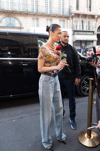 Так, Белла надела удлиненные джинсы классического голубого цвета, дополнив их широким кожаным ремнем. Но главной деталью образа стал топ с принтом, характерным для стиля 90-х и 80-х. Еще одна ретро-деталь — это обувь Беллы с длинным узким мысом на манер прошлых десятилетий.