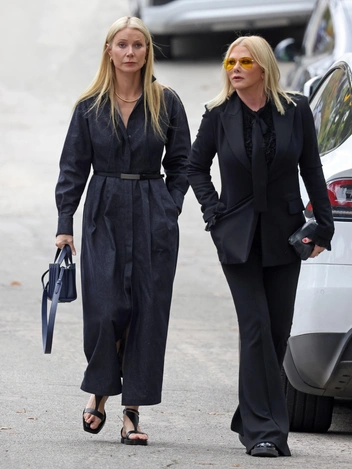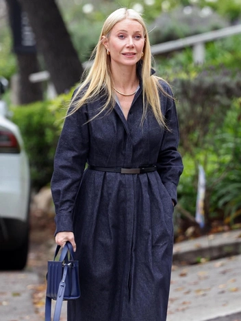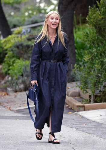 Как во время своего последнего выхода: Гвинет надела темно-синий джинсовый комбинезон длины макси, сочетая его с сандалиями черного цвета. В аутфите акрисы был трендовый прием — она повязала тонкий пояс вокруг талии, как делали модели на Неделях моды FW/25-26.
