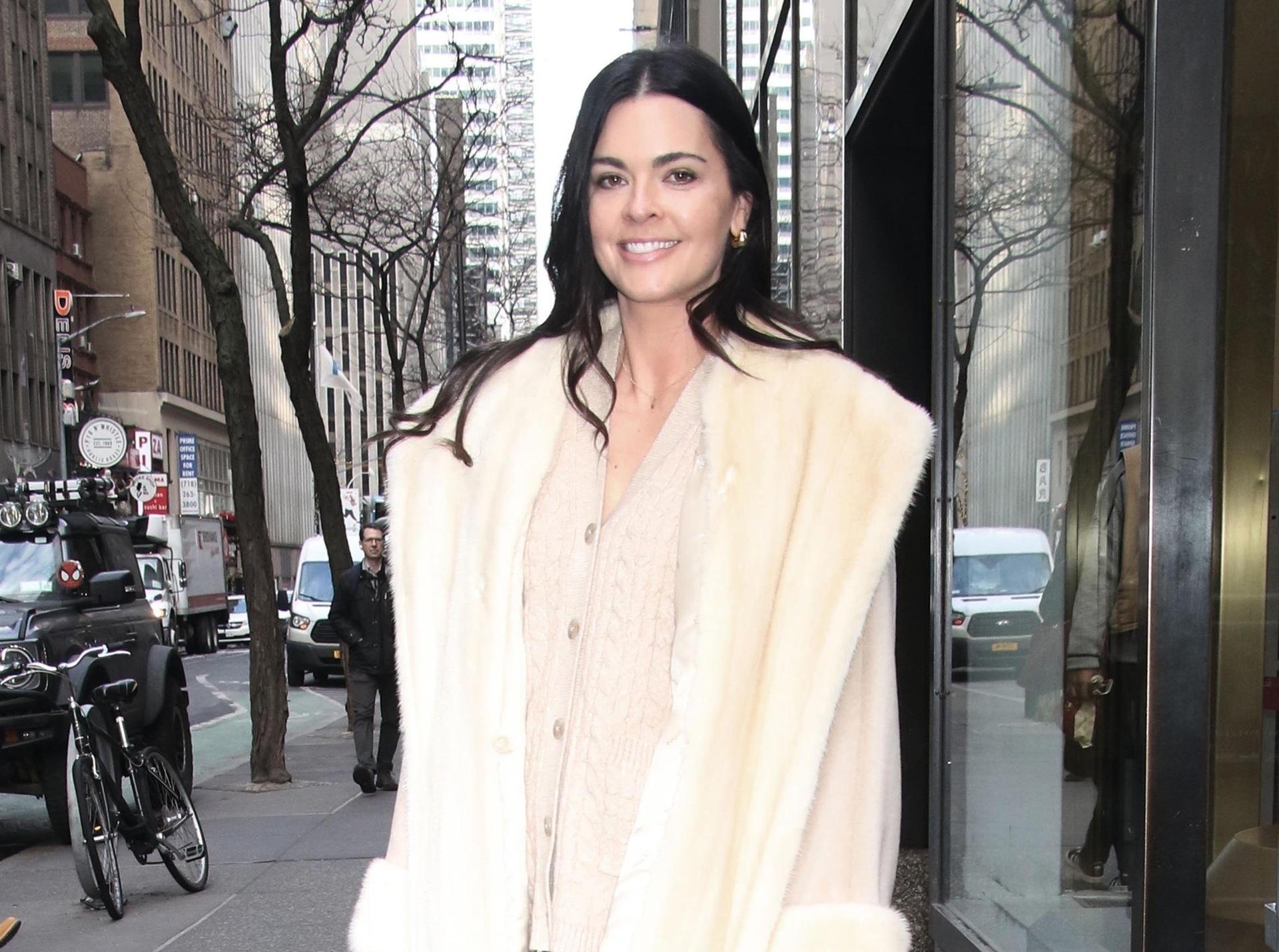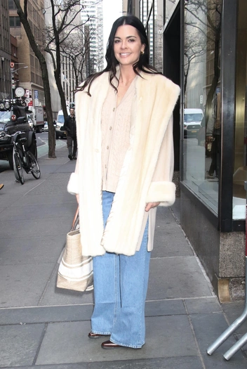 Кэти показывает, как меховой шарф работает в реальной жизни, а не только на подиуме: кремовую шубу с контрастной «полосой» из пушистого меха она надевает поверх вязаного кардигана в тон и свободных джинсов, превращая простой деним‑лук в очень «дорогой» городской образ. Объемный шарф буквально заменяет ювелирные украшения: красиво обрамляет лицо и при этом не спорит с повседневными вещами — именно такой способ носить модные меховые аксессуары сейчас чаще всего советуют стилисты.