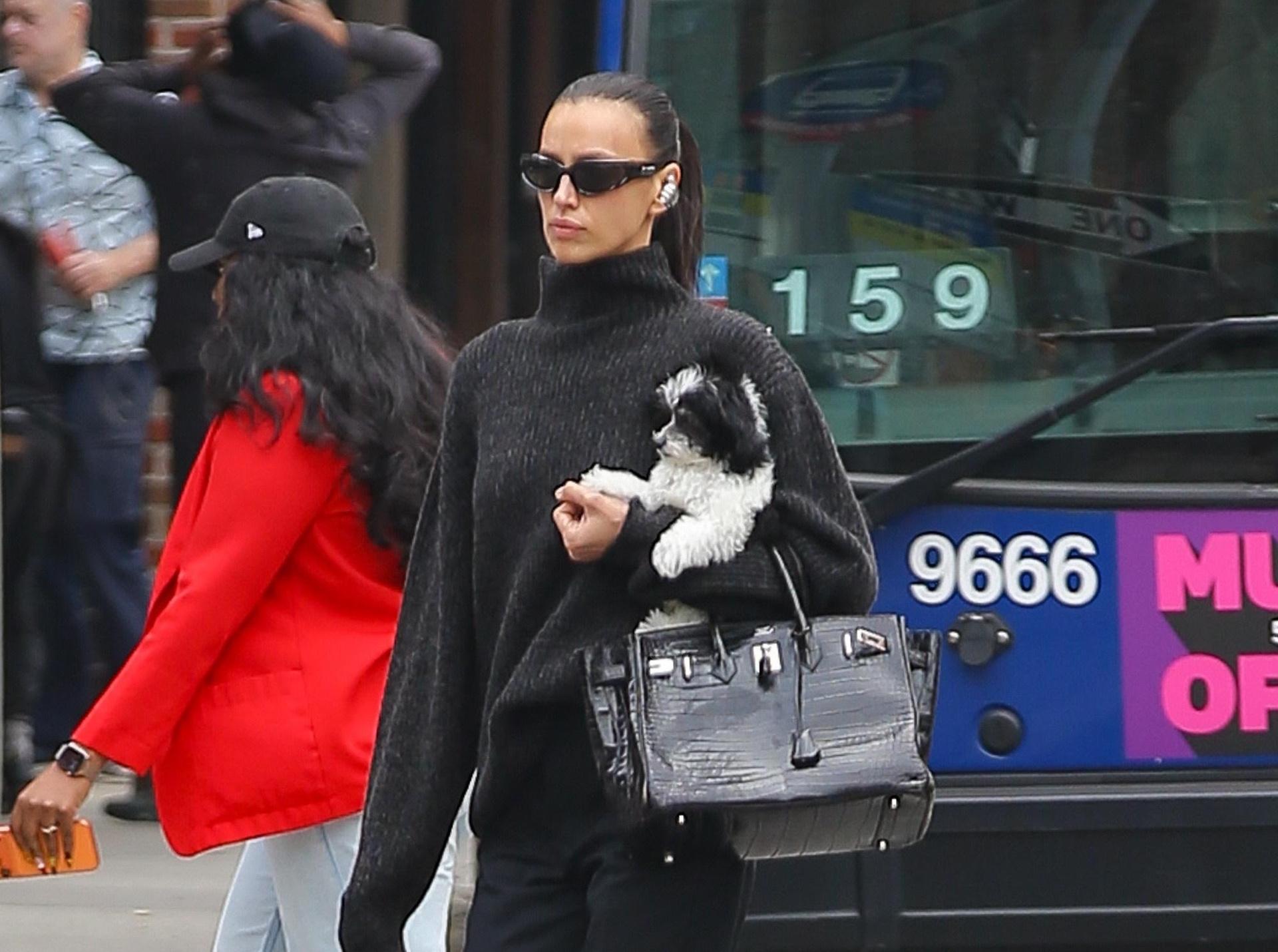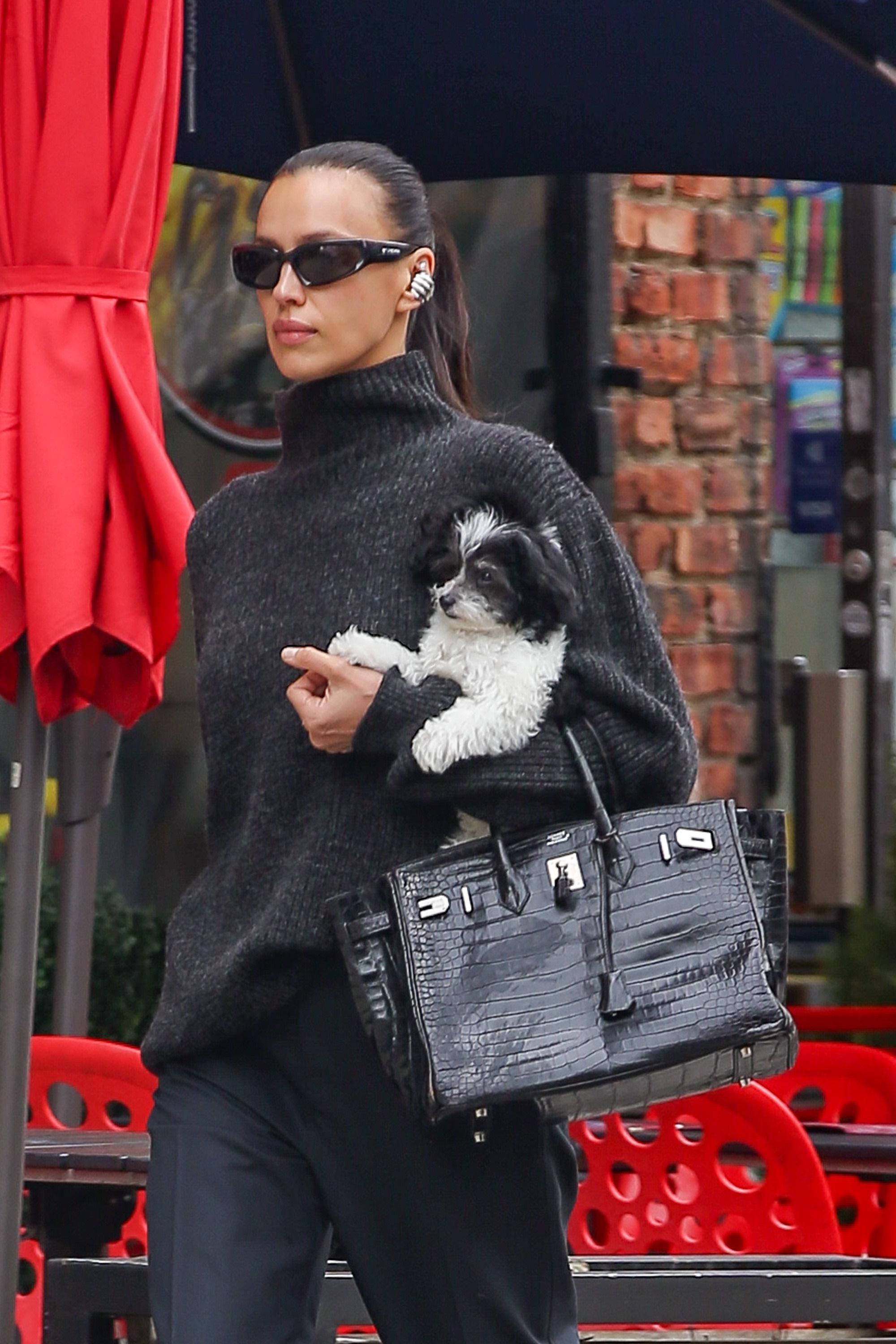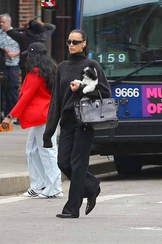 В образах Ирины Шейк черный работает лучше всего, когда он не один, а играет сразу в нескольких фактурах. В этом выходе модель собирает total black из ворсистого свитера, гладких строгих брюк, полированных лоферов и жесткой массивной сумки Birkin кроко — и за счет контраста текстур аутфит выглядит объемным, роскошным и совсем не скучным. Главное правило Ирины остается неизменным: чем проще палитра, тем смелее можно миксовать материалы.