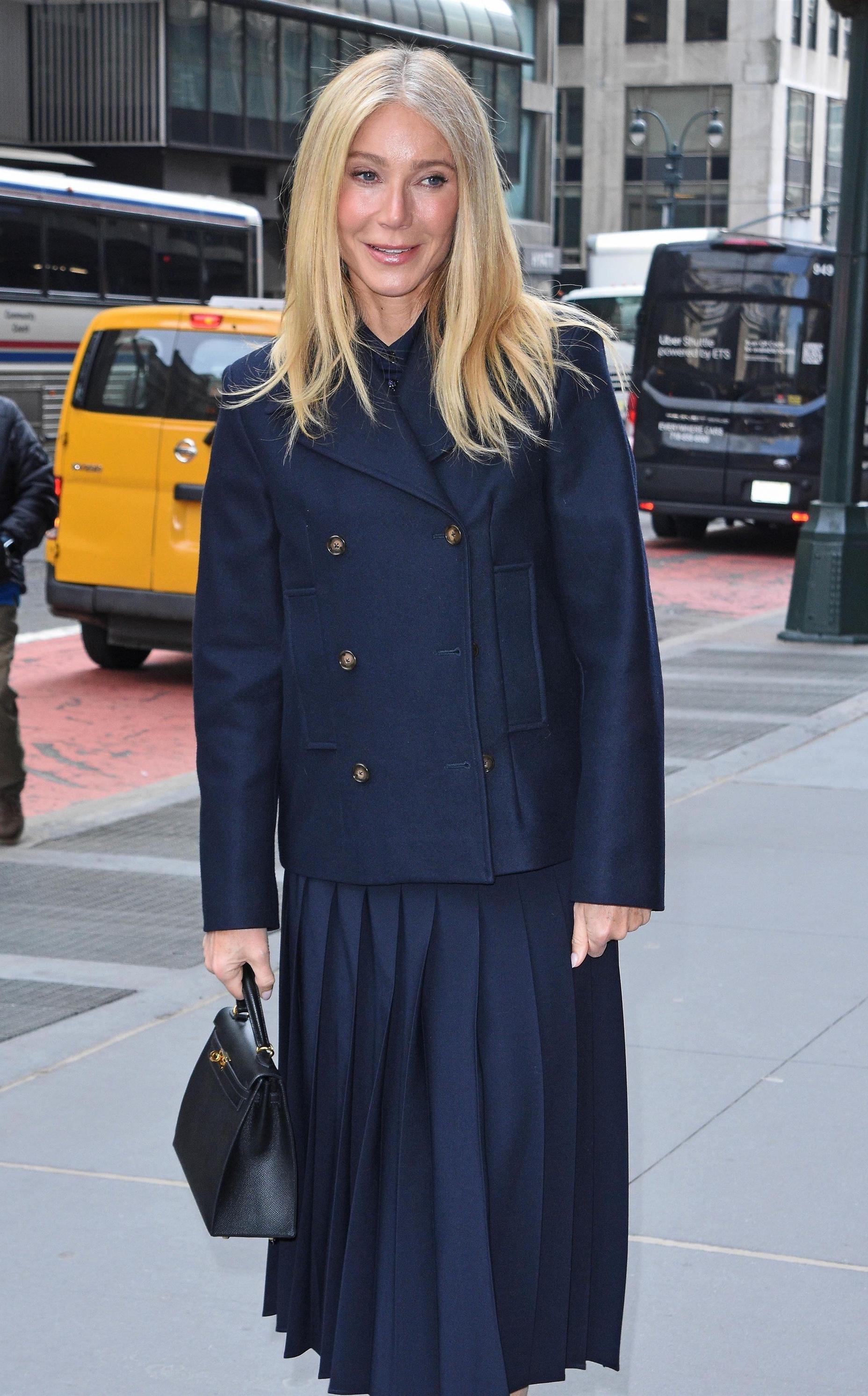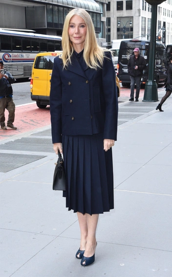Гвинет Пэлтроу снова доказывает, что истинная элегантность не нуждается в эффектных жестах: в ее последнем выходе все строится на точности силуэта и выверенной палитре. Темно-синий total look с четкой линией жакета и плиссированной юбкой выглядит безупречно собранно, а не нарочито расслабленно. Именно в этой сдержанности и заключается сила образа — он не стремится произвести эффект, а спокойно транслирует вкус актрисы, ее модную дисциплину и умение держать форму. Никакой показной небрежности — только тихая, очень спокойная элегантность, которую поддерживают маленькая черная сумка и лаконичные туфли.