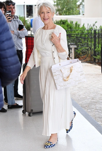 Каннский кинофестиваль — это не только отличное кино и веселые вечеринки, но и теплое море, яркое солнце и красивая природа в мае. Гулять по Каннам — настоящее удовольствие, а сам город после каменных джунглей крупных мегаполисов кажется настоящим оазисом. Не упустила возможность прогуляться по набережным и Хелен Миррен. Длинное белое платье и синие лоферы в горошек: такой простой, но милый наряд ей очень идет. Согласны?