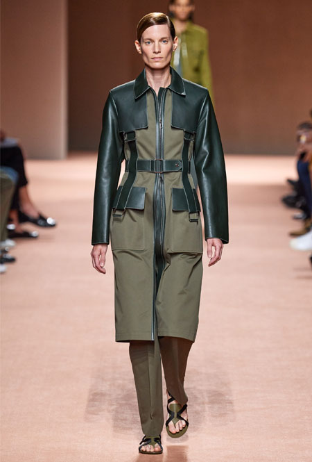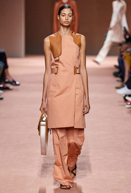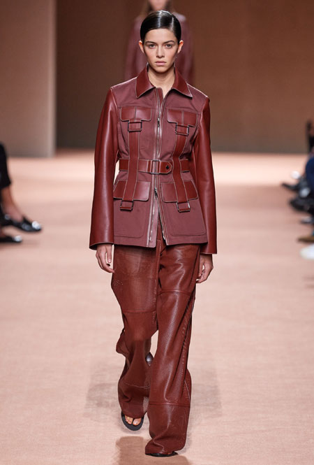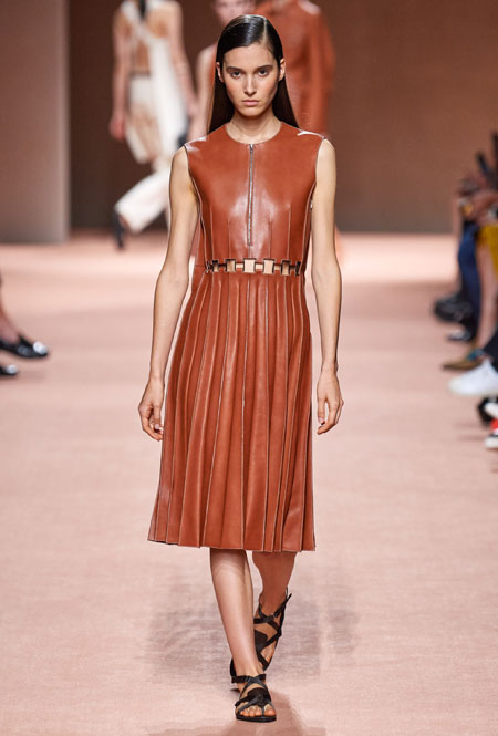 В новой коллекции креативный директор бренда Надеж Ване-Цыбульски показала свое мастерство в работе с кожей – самым трендовым материалом последних сезонов. Для весны и лета дизайнер предлагает универсальную природную палитру: песочно-серый, миндальный, хаки, оттенки киви и насыщенный винный. В этой цветовой гамме были выполнены минималистичные фартуки из плотной кожи, платья с плиссированными юбками, лаконичные топы, трикотажные костюмы с майками и мини-шортами, а также структурированные жакеты в милитари-стиле с накладными карманами.