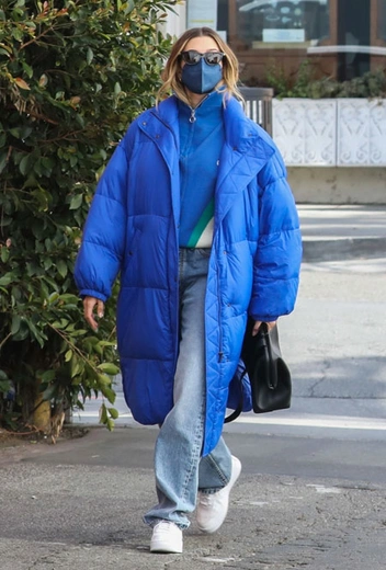 Для Лос-Анджелеса тоже нередки холода. А поэтому стритстайл-образы, которые предлагает икона стиля Хейли Бибер, вполне применимы и для наших широт. Накануне девушка отправилась на свидание со своим супругом Джастином Бибером и примерила пуховик в самом приятном оттенке электрик. Звезда дополнила аутфит спортивной олимпийкой в тон, базовыми синими джинсами и массивными белыми кроссовками.