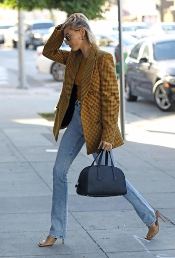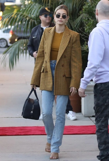Как насчет того, чтобы сделать офисный образ чуть более смелым и даже экстравагантным? Нашли отличный пример того, как это можно воплотить в жизнь. Идею подает, конечно же, Хейли Бибер — главная по экспериментам с бизнес-стилем. Звезда стритстайла выбирает светлую джинсу, охру и нюд в качестве основных оттенков для своего аутфита. Оверсайз-жакет в клетку дополняет кофта в тон, прямые джинсы и нюдовые мюли на небольшом каблуке.