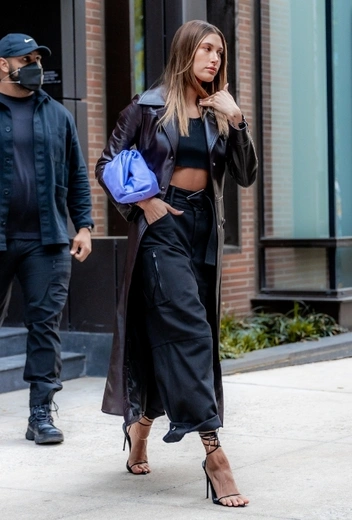 Шарм повседневных выходов Хейли Бибер заключается в элегантности и женственности вне зависимости от формата: будь то полуспортивный костюм или вечернее платье — модели всегда удается выглядеть утонченно и подчеркивать аутентичность своего вкуса. Для любителей образов в темной палитре оттенков Хейли подает оригинальную идею, как найти достойную альтернативу лаконичным тотальным лукам. Звезда примеряет брючную комбинацию с черным укороченным топом и кожаным пальто в темно-шоколадном оттенке. Колор-сочетание удачно оттеняет мягкая сине-фиолетовая сумка, а пикантности образу придают открытые босоножки на завязках.