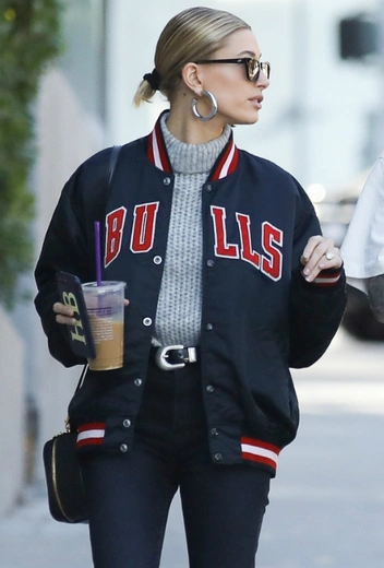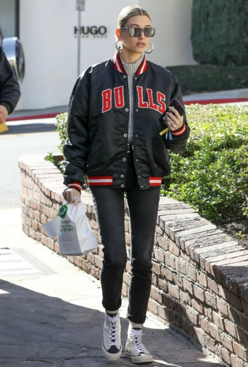Черный бомбер смотрится на Хейли ну очень стильно. Модель сочетает его с плотным свитером серого оттенка, черными джинсами скинни и белыми конверсами. Из аксессуаров — черные очки и клатч на одно плечо. Забираем эту комбинацию для прохладных весенних и летних дней наступившего года.