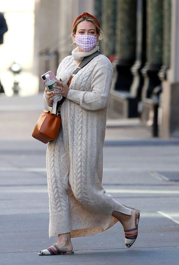 Селебрити все реже дразнят нас легкими и летними платьями осенью и постепенно облачаются в теплые и уютные аутфиты. Правда, мягкий климат Нью-Йорка позволяет комбинировать тренды двух сезонов и при этом не жертвовать своим комфортом. Отличный пример межсезонного аутфита показала на днях Хилари Дафф. От невесомых нарядов она отказалась и отдала предпочтение теплому трикотажному платью длины макси молочного оттенка. Завершала аутфит неожиданная деталь – мюли, которые мы чаще видим в летних образах, однако для коротких прогулок по улице даже такая обувь будет вполне уместна.