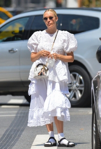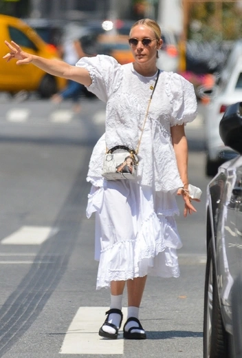 Стиль Хлои Севиньи всегда становится предметом жарких обссуждений модных обозревателей: актриса практически никогда не ориентируется на актуальную трендовую повестку, демонстрируя аутентичность своего вкуса. Для летней прогулки по городу звезда подбирает комбинацию с юбкой и пышной текстурированной блузой, которую дополняет черными сандалиями с высокими белыми носками. Аутфит завершают солнцезащитные очки и сумка с арт-принтом.