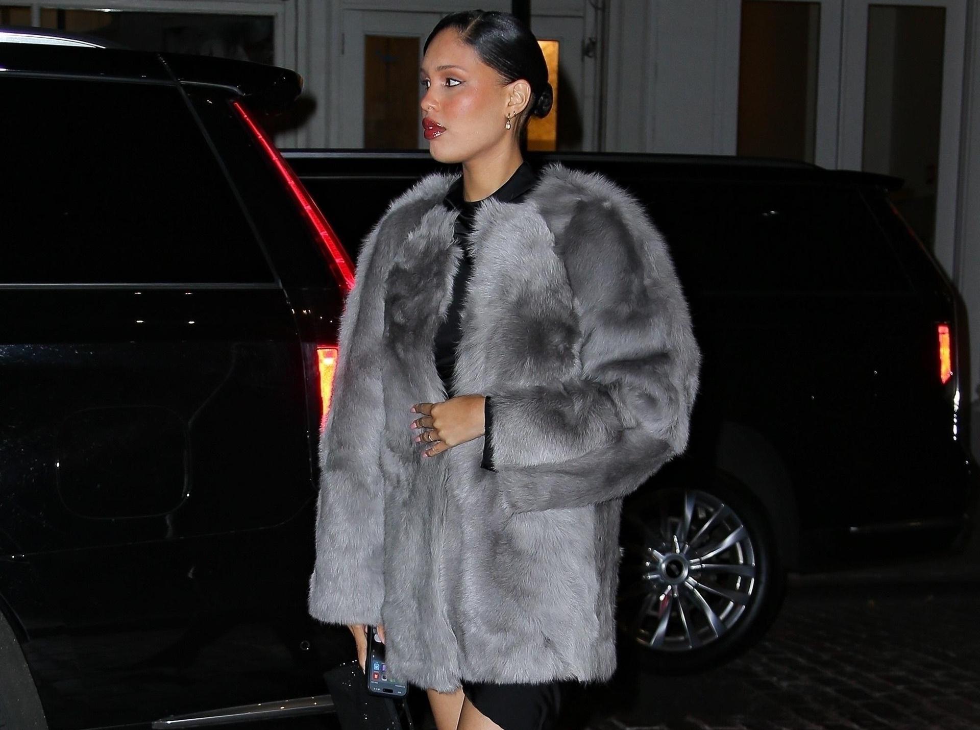 Нара Смит как всегда выглядела стильно и эффектно, появившись на вечеринке в Нью-Йорке. Для этого выхода она выбрала роскошную серую шубу — модный и теплый вариант для осенне-зимнего сезона, снизу — короткая юбка, которая добавила образу легкости и нотку дерзости, в сочетании с высокими ботфортами, подчеркивающими стройные ноги модели. Акцентом в макияже стала глубокая темно-красная помада — классическое и смелое решение в стиле Нары, которое идеально дополнило монохромную гамму лука и добавило образу драматизма и элегантности.