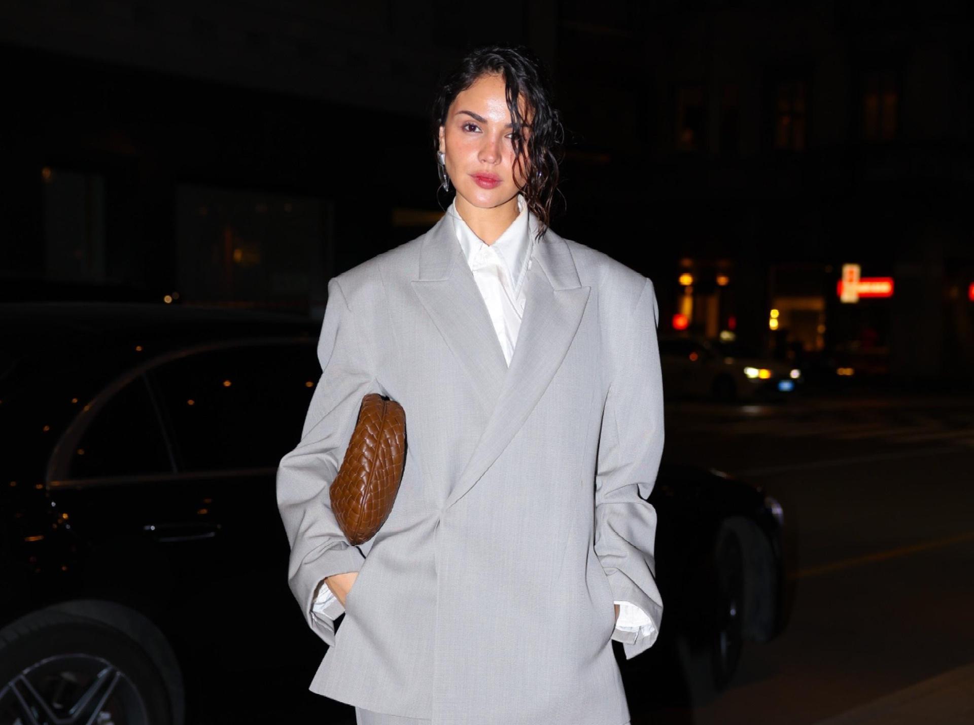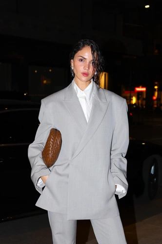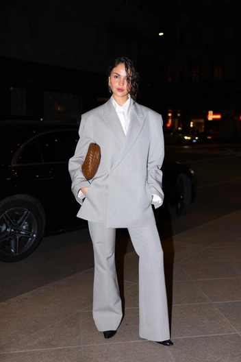 Идеальный брючный костюм на весну 2026 года — это строгий, но расслабленный светло‑серый оверсайз‑ансамбль от Bottega Veneta: удлиненный пиджак мужского кроя, прямые, слегка расклешенные брюки, белая рубашка без лишних деталей и всего один теплый акцент — плетеный коричневый клатч, который добавляет текстуры и делает монохромный офисный сет по‑по‑милански роскошным и вечерним.