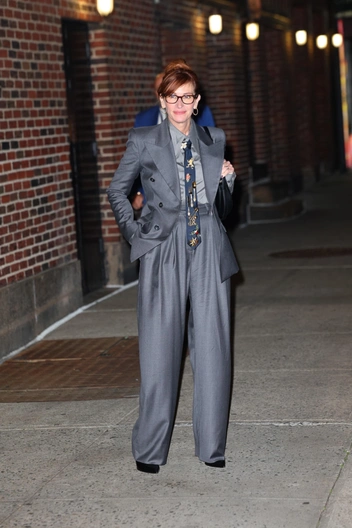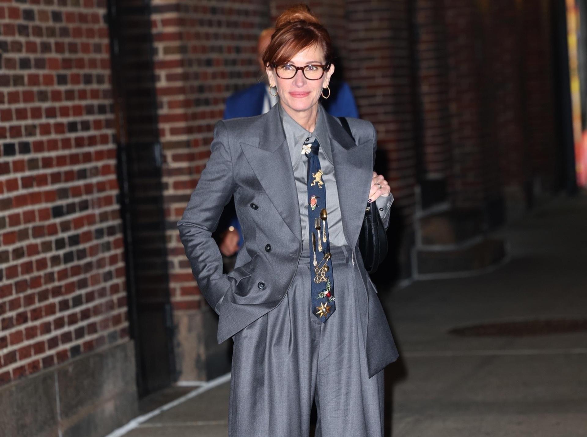 Надень Джулия простой однотонный галстук, ее образ смотрелся бы слишком базово — а с этим «детским» аксессуаром заиграл новыми красками. Не хотите носить инфантильные принты, тогда замените их на более привычный горошек или цветную полоску. А вот костюм рекомендуем оставить тот же: идеально сидящий двубортный пиджак и широкие брюки выглядят не слишком андрогинно, так как Джулия сочетала их с остроносыми лодочками. Безупречная формула для офисного лука.
