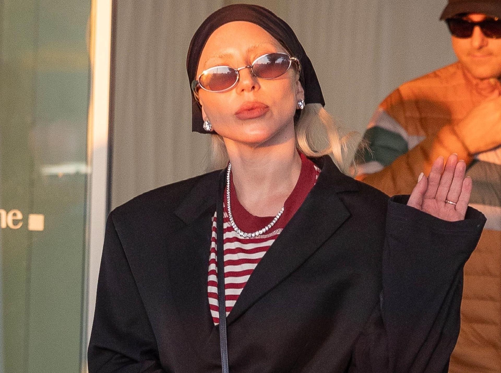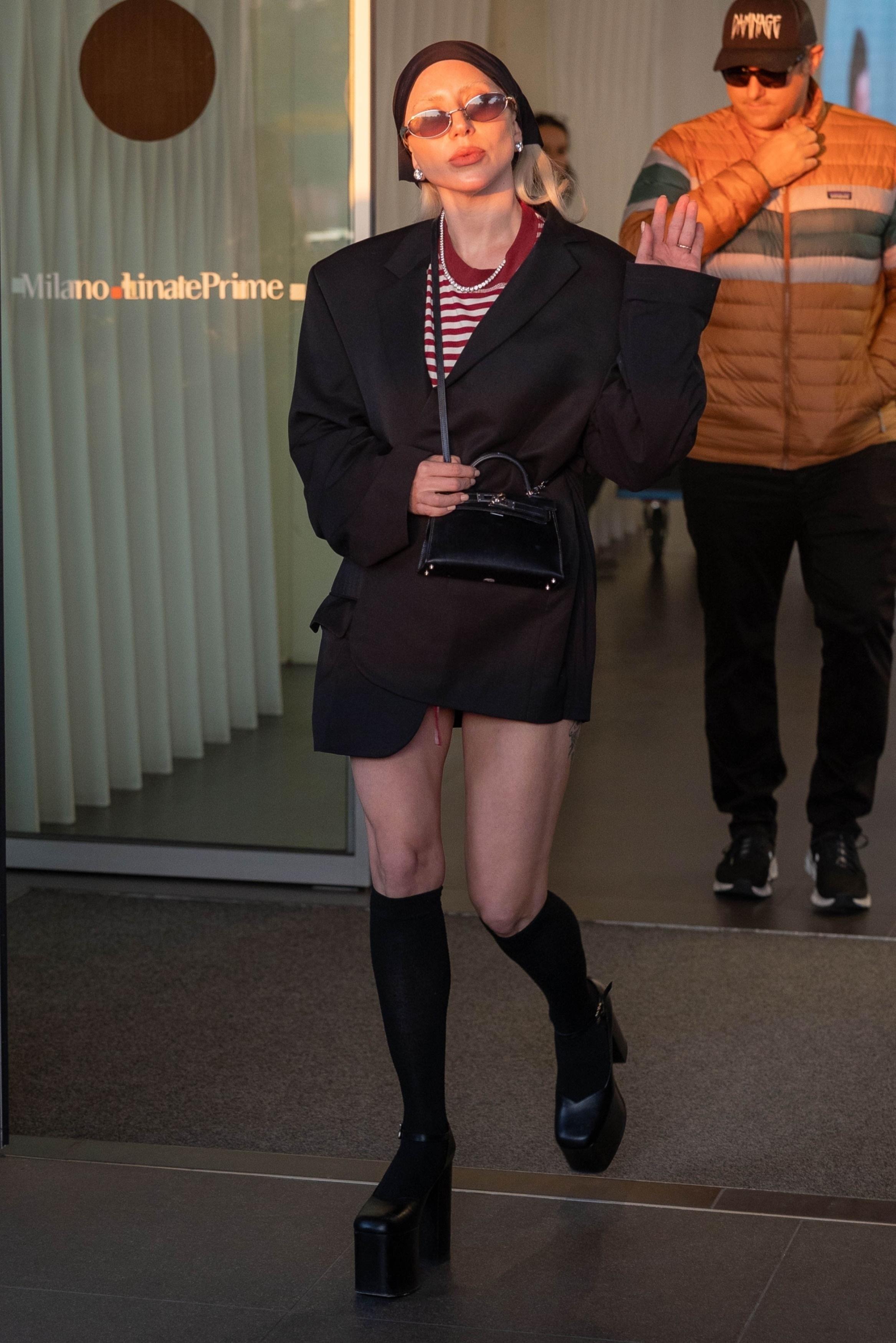 Леди Гага прибыла в Милан перед Неделей моды вместе с бойфрендом Майклом Полански, и прямо с трапа самолета продемонстрировала Италии свой фирменный стиль с нотками дерзости и элегантности. Для выхода она выбрала черный пиджак — классический, но с современным силуэтом, который органично сочетался с полосатой футболкой-морячкой, придавая образу легкую непринужденность. Завершали аутфит стильная косынка, высокие гетры и ее фирменные высокие каблуки, которые всегда добавляют эффектности и подчеркивают индивидуальность певицы.
