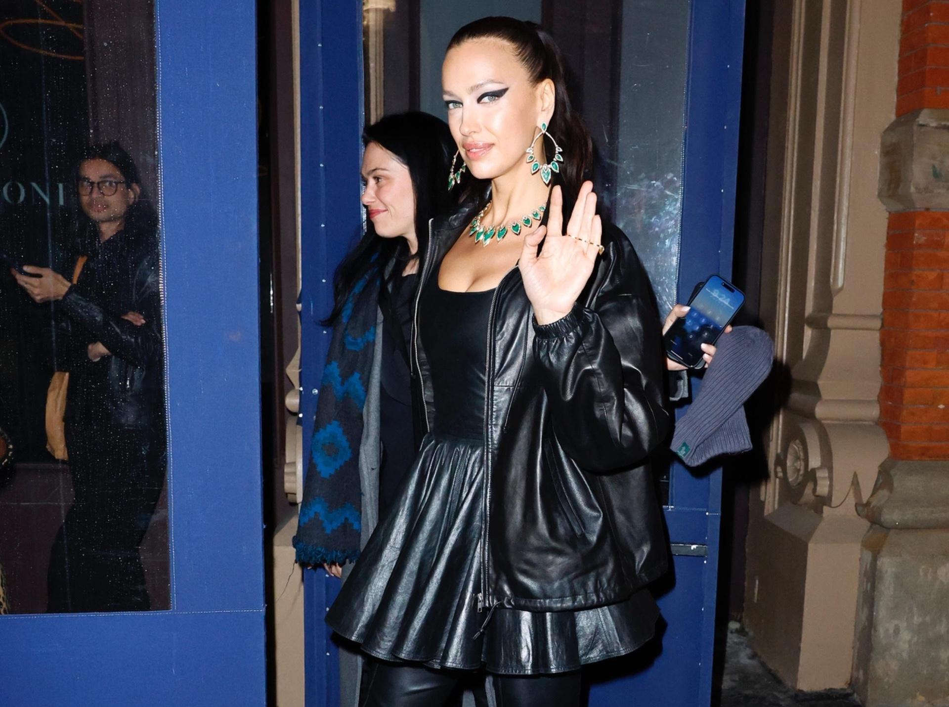 Ирина Шейк еще раз подтверждает: главное вложение в вечерний гардероб — акцентные украшения. На базе гранжевого и дерзкого образа она строит роскошный аутфит за счет массивного изумрудного колье и серьг, которые визуально подсвечивают вырез и плечи модели. Такой сет идеально попадает в тренд 2026 года на крупные цветные камни и максимально выразительную бижутерию, которая автоматически выводит ваши даже самые базовые и повседневыне образы на несколько фешн-уровней вверх.