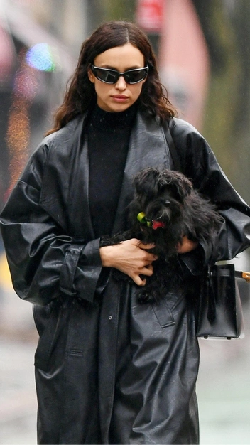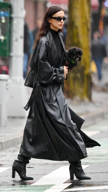 По выходам Ирины Шейк не так уж и трудно догадаться, какая верхняя одежда весной будет самой модной. Знаменитость делает ставку на кожу и трендовый оверсайз и выбирает для повседневных аутфитов эффектный плащ со спущенными плечами в длине макси. Его она стилизует по всем канонам тотал-лука: с черным трикотажным платьем, кожаными сапогами-слоучами и ультрамодными солнцезащитными очками.