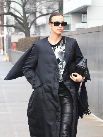 Черный цвет давно и прочно вписался в стиль Ирины Шейк. Сейчас представить ее наряды без интеграции этого глубокого оттенка очень сложно. За годы экспериментов с ним она научилась носить его так, чтобы он не выглядел скучно. В новом выходе она показала, как правильно составлять тотал-луки в этом оттенке. Звезда взяла за основу удлиненный пуховик без воротника и дополнила образ кожаными брюками, топом с принтом и очками с цепочкой.